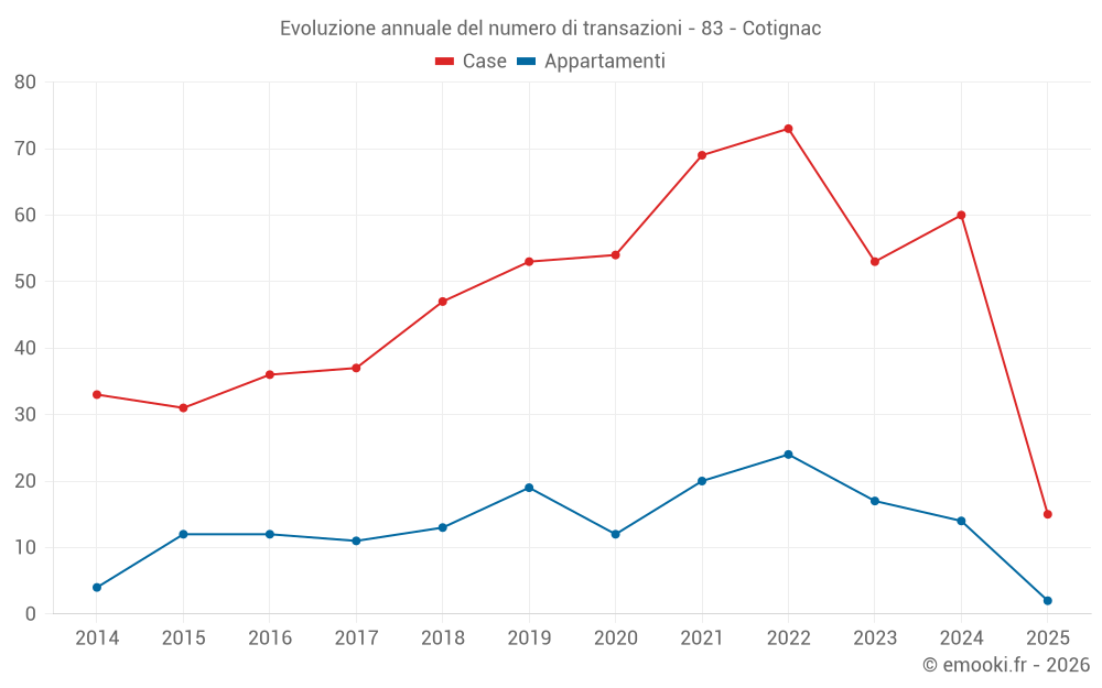 Il prezzo mediano sulle 22 transazioni di appartamenti degli ultimi 24 mesi nel comune di Cotignac era di 2 158 € al metro quadrato per un valore patrimoniale mediano di 134 250 €. In questo periodo il 60% delle transazioni era tra 1 965 e 2 819 € al metro quadrato (dal 2° all'8° decile).