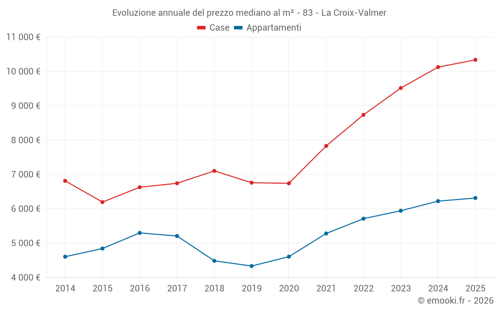 Il prezzo mediano sulle 20 transazioni di case degli ultimi 3 mesi nel comune di La Croix-Valmer era di 9 205 € al metro quadrato per un valore patrimoniale mediano di 927 000 €. In questo periodo il 60% delle transazioni era tra 6 456 e 11 305 € al metro quadrato (dal 2° all'8° decile).