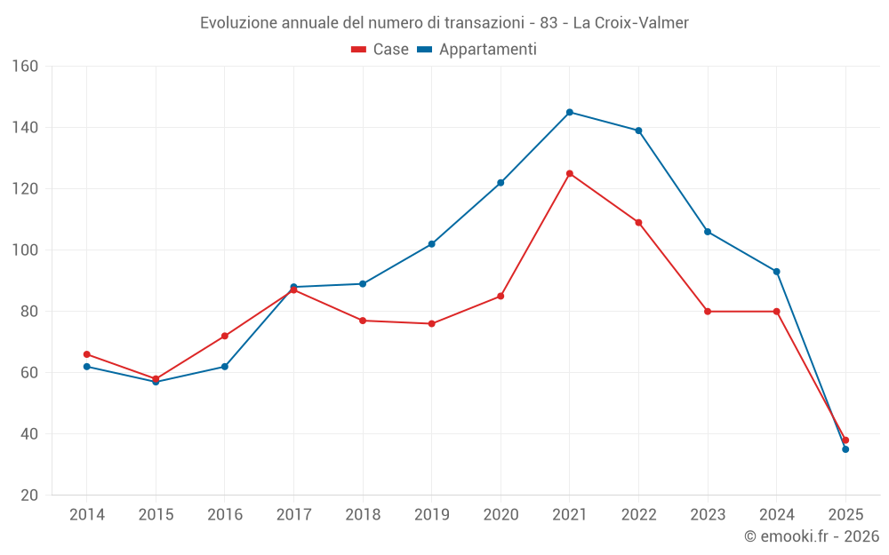 Il prezzo mediano sulle 35 transazioni di appartamenti degli ultimi 6 mesi nel comune di La Croix-Valmer era di 6 316 € al metro quadrato per un valore patrimoniale mediano di 284 465 €. In questo periodo il 60% delle transazioni era tra 5 021 e 8 063 € al metro quadrato (dal 2° all'8° decile).