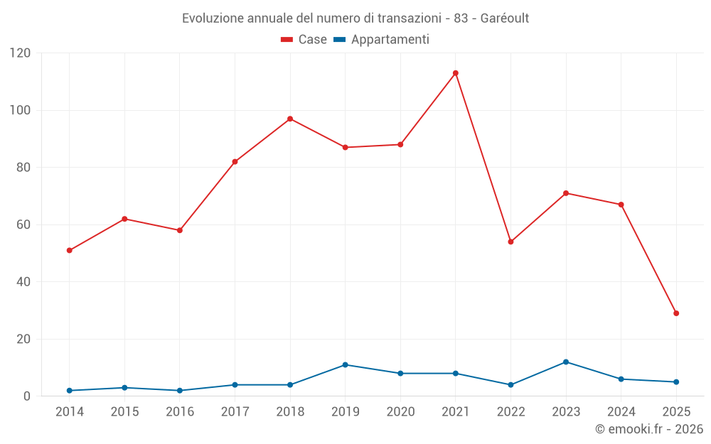 Il prezzo mediano sulle 29 transazioni di case degli ultimi 6 mesi nel comune di Garéoult era di 3 727 € al metro quadrato per un valore patrimoniale mediano di 363 400 €. In questo periodo il 60% delle transazioni era tra 2 934 e 4 316 € al metro quadrato (dal 2° all'8° decile).