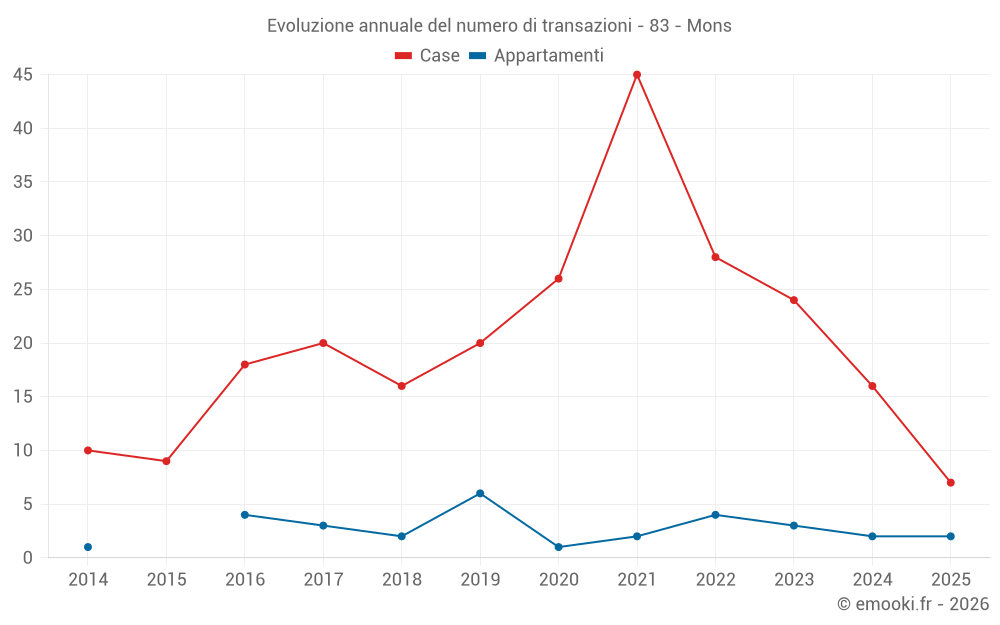 Il prezzo mediano sulle 18 transazioni di case degli ultimi 12 mesi nel comune di Mons era di 3 506 € al metro quadrato per un valore patrimoniale mediano di 352 500 €. In questo periodo il 60% delle transazioni era tra 2 449 e 4 378 € al metro quadrato (dal 2° all'8° decile).