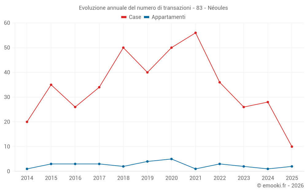 Il prezzo mediano sulle 27 transazioni di case degli ultimi 12 mesi nel comune di Néoules era di 3 346 € al metro quadrato per un valore patrimoniale mediano di 300 000 €. In questo periodo il 60% delle transazioni era tra 2 090 e 3 921 € al metro quadrato (dal 2° all'8° decile).