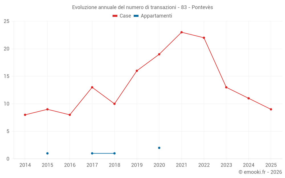 Il prezzo mediano sulle 30 transazioni di case degli ultimi 24 mesi nel comune di Pontevès era di 2 748 € al metro quadrato per un valore patrimoniale mediano di 192 500 €. In questo periodo il 60% delle transazioni era tra 1 549 e 3 403 € al metro quadrato (dal 2° all'8° decile).