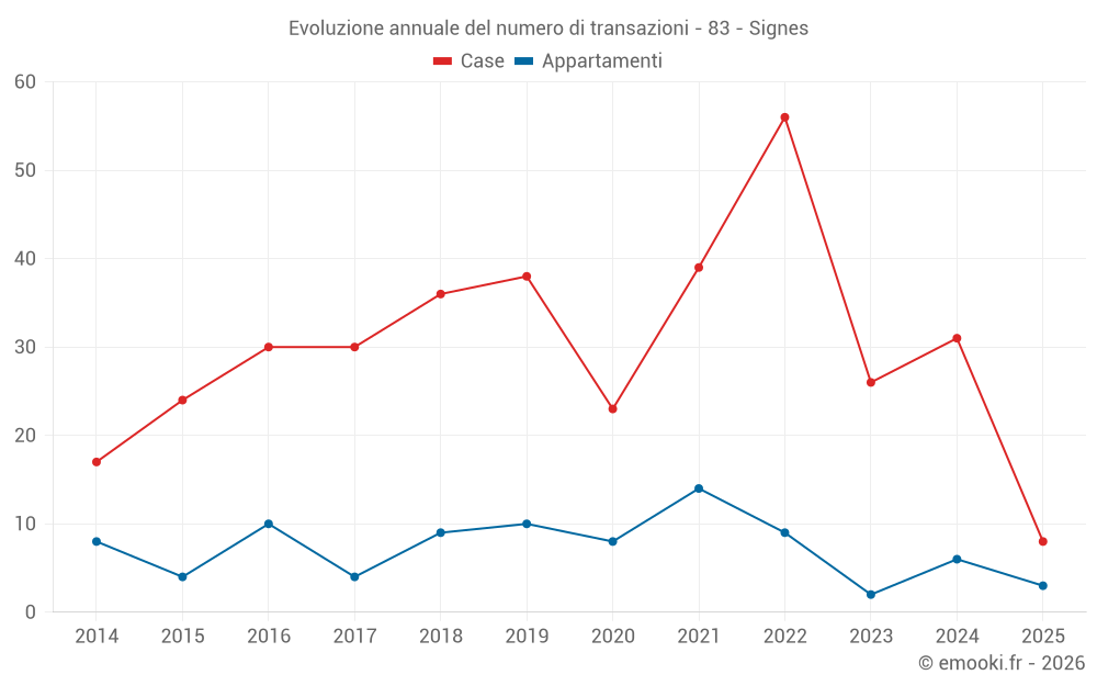 Il prezzo mediano sulle 29 transazioni di case degli ultimi 12 mesi nel comune di Signes era di 3 864 € al metro quadrato per un valore patrimoniale mediano di 310 000 €. In questo periodo il 60% delle transazioni era tra 2 752 e 4 815 € al metro quadrato (dal 2° all'8° decile).