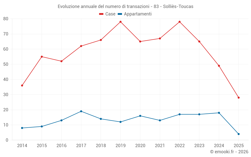 Il prezzo mediano sulle 28 transazioni di case degli ultimi 6 mesi nel comune di Solliès-Toucas era di 3 781 € al metro quadrato per un valore patrimoniale mediano di 400 700 €. In questo periodo il 60% delle transazioni era tra 3 237 e 4 770 € al metro quadrato (dal 2° all'8° decile).