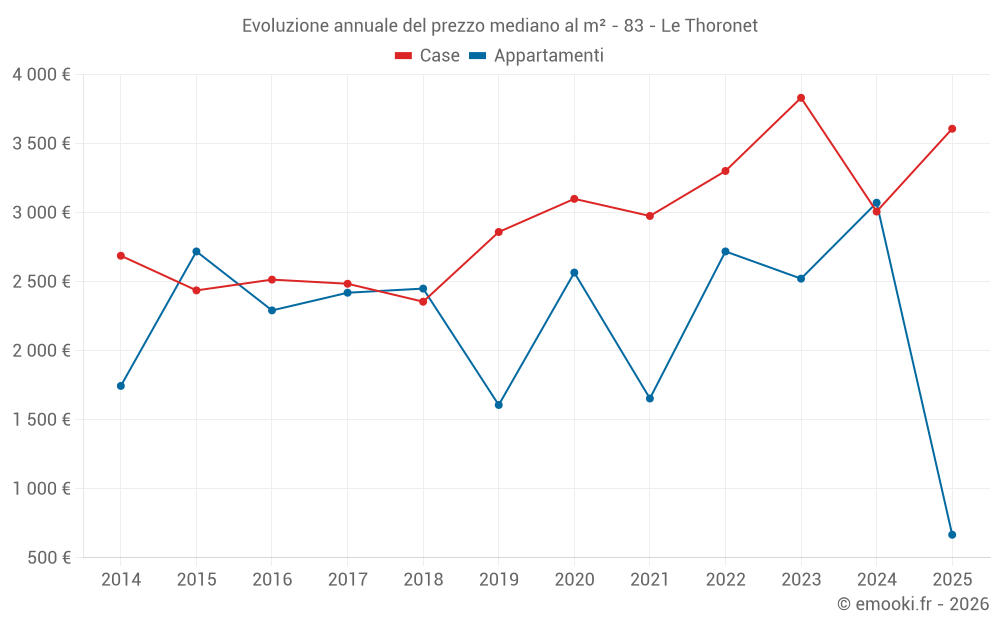 Il prezzo mediano sulle 29 transazioni di case degli ultimi 12 mesi nel comune di Le Thoronet era di 3 067 € al metro quadrato per un valore patrimoniale mediano di 320 000 €. In questo periodo il 60% delle transazioni era tra 2 458 e 3 814 € al metro quadrato (dal 2° all'8° decile).
