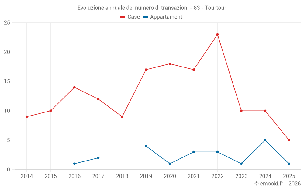 Il prezzo mediano sulle 22 transazioni di case degli ultimi 24 mesi nel comune di Tourtour era di 2 946 € al metro quadrato per un valore patrimoniale mediano di 331 125 €. In questo periodo il 60% delle transazioni era tra 1 619 e 4 899 € al metro quadrato (dal 2° all'8° decile).