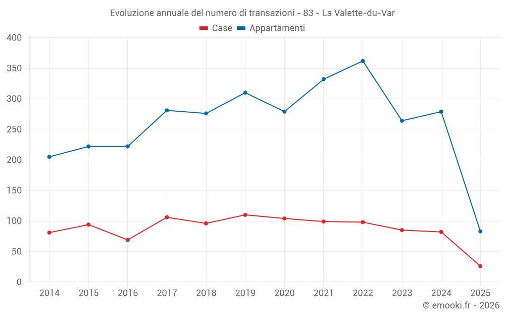 Il prezzo mediano sulle 28 transazioni di appartamenti degli ultimi 3 mesi nel comune di La Valette-du-Var era di 2 806 € al metro quadrato per un valore patrimoniale mediano di 197 165 €. In questo periodo il 60% delle transazioni era tra 2 403 e 3 860 € al metro quadrato (dal 2° all'8° decile).