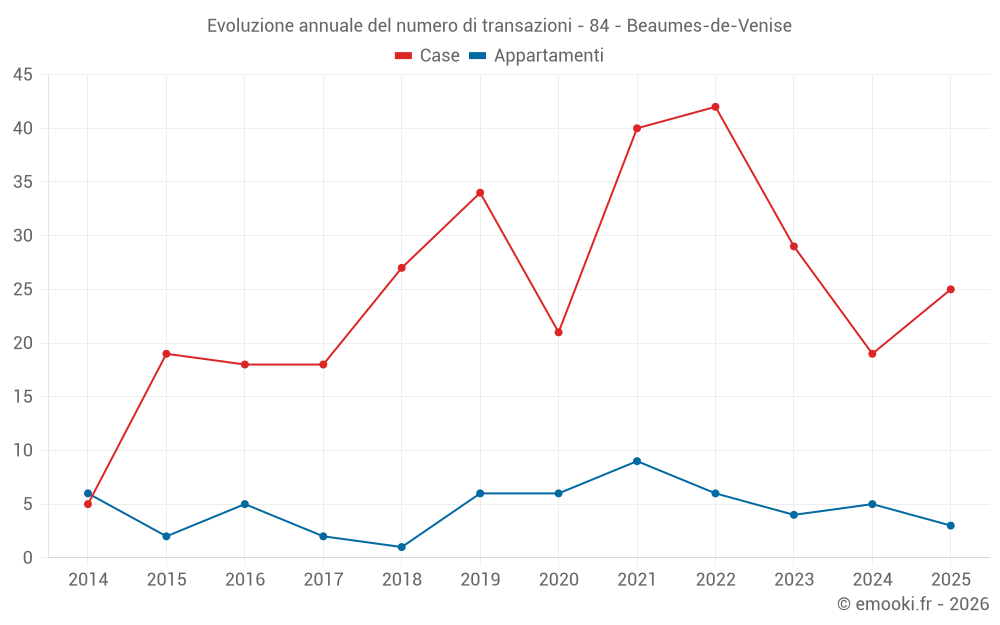 Il prezzo mediano sulle 25 transazioni di case degli ultimi 12 mesi nel comune di Beaumes-de-Venise era di 2 987 € al metro quadrato per un valore patrimoniale mediano di 230 000 €. In questo periodo il 60% delle transazioni era tra 1 924 e 3 918 € al metro quadrato (dal 2° all'8° decile).