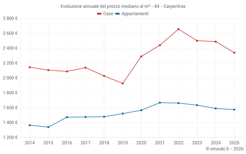Il prezzo mediano sulle 26 transazioni di case degli ultimi 3 mesi nel comune di Carpentras era di 2 324 € al metro quadrato per un valore patrimoniale mediano di 215 000 €. In questo periodo il 60% delle transazioni era tra 1 556 e 3 338 € al metro quadrato (dal 2° all'8° decile).