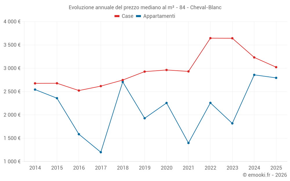 Il prezzo mediano sulle 34 transazioni di case degli ultimi 12 mesi nel comune di Cheval-Blanc era di 3 276 € al metro quadrato per un valore patrimoniale mediano di 315 550 €. In questo periodo il 60% delle transazioni era tra 2 417 e 4 057 € al metro quadrato (dal 2° all'8° decile).