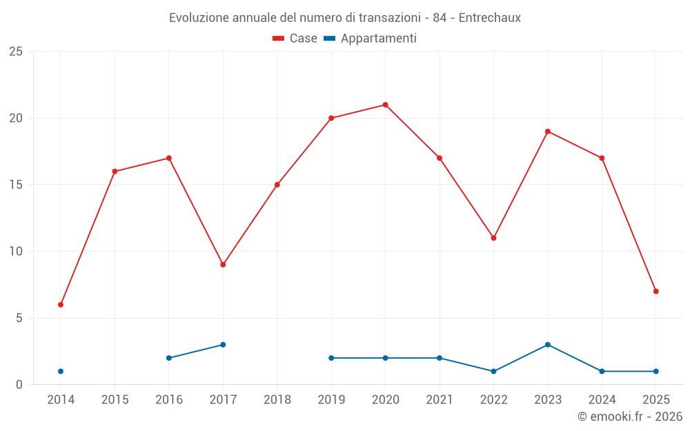 Il prezzo mediano sulle 35 transazioni di case degli ultimi 24 mesi nel comune di Entrechaux era di 2 947 € al metro quadrato per un valore patrimoniale mediano di 274 950 €. In questo periodo il 60% delle transazioni era tra 2 299 e 4 069 € al metro quadrato (dal 2° all'8° decile).