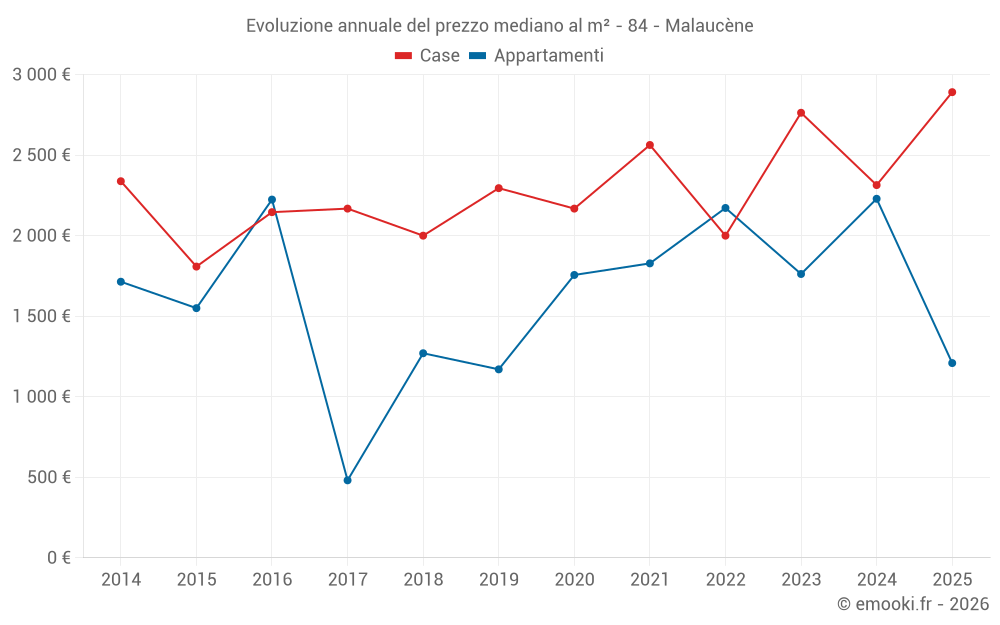 Il prezzo mediano sulle 30 transazioni di case degli ultimi 12 mesi nel comune di Malaucène era di 2 748 € al metro quadrato per un valore patrimoniale mediano di 190 000 €. In questo periodo il 60% delle transazioni era tra 1 611 e 4 140 € al metro quadrato (dal 2° all'8° decile).
