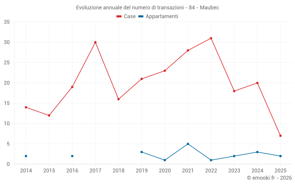 Il prezzo mediano sulle 22 transazioni di case degli ultimi 12 mesi nel comune di Maubec era di 3 644 € al metro quadrato per un valore patrimoniale mediano di 361 000 €. In questo periodo il 60% delle transazioni era tra 2 986 e 4 674 € al metro quadrato (dal 2° all'8° decile).