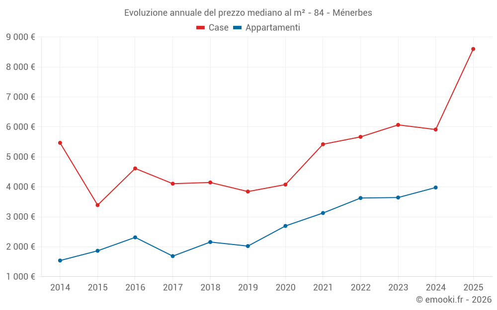 Il prezzo mediano sulle 27 transazioni di case degli ultimi 24 mesi nel comune di Ménerbes era di 6 530 € al metro quadrato per un valore patrimoniale mediano di 910 000 €. In questo periodo il 60% delle transazioni era tra 4 432 e 9 748 € al metro quadrato (dal 2° all'8° decile).