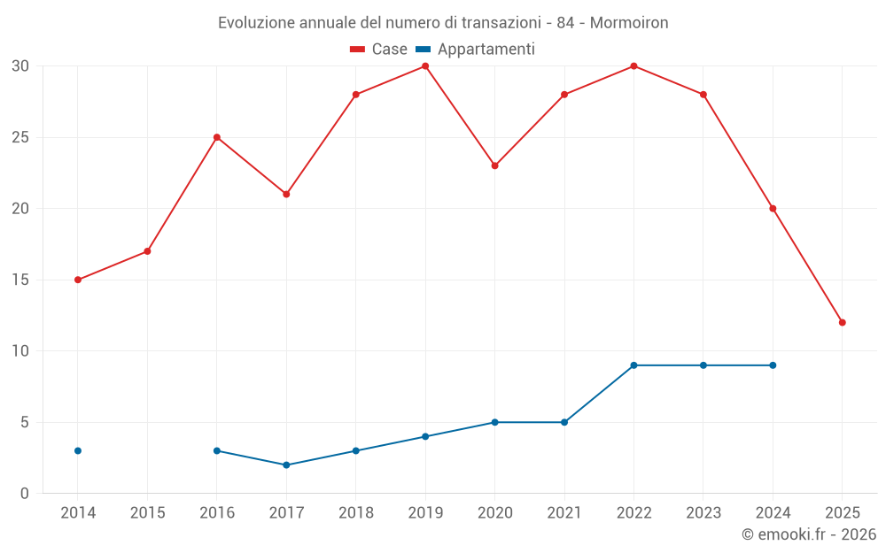 Il prezzo mediano sulle 22 transazioni di case degli ultimi 12 mesi nel comune di Mormoiron era di 2 748 € al metro quadrato per un valore patrimoniale mediano di 312 500 €. In questo periodo il 60% delle transazioni era tra 2 206 e 3 899 € al metro quadrato (dal 2° all'8° decile).