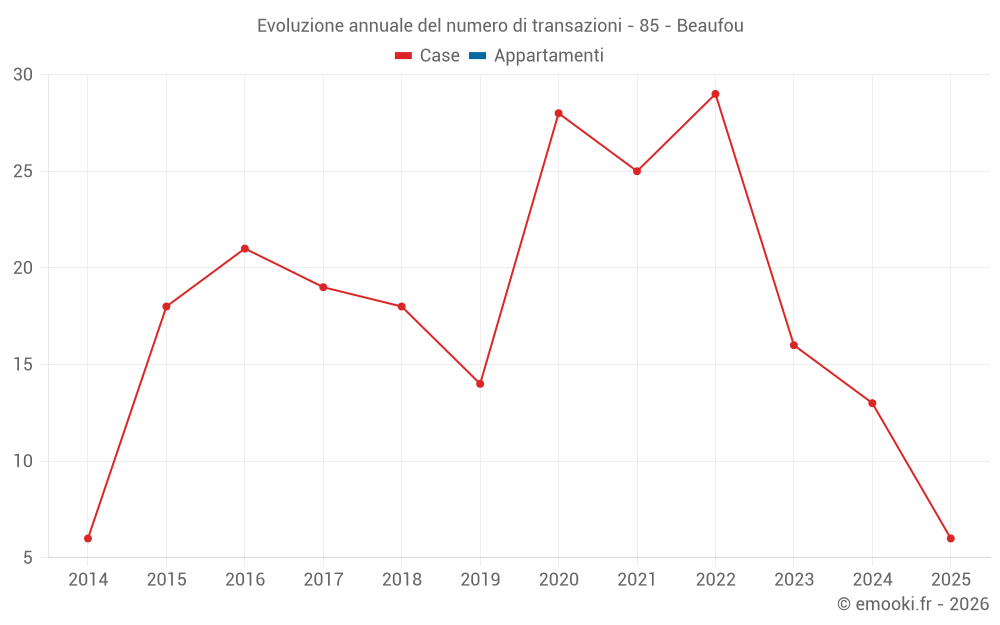 Il prezzo mediano sulle 16 transazioni di case degli ultimi 12 mesi nel comune di Beaufou era di 1 697 € al metro quadrato per un valore patrimoniale mediano di 219 890 €. In questo periodo il 60% delle transazioni era tra 1 250 e 2 391 € al metro quadrato (dal 2° all'8° decile).