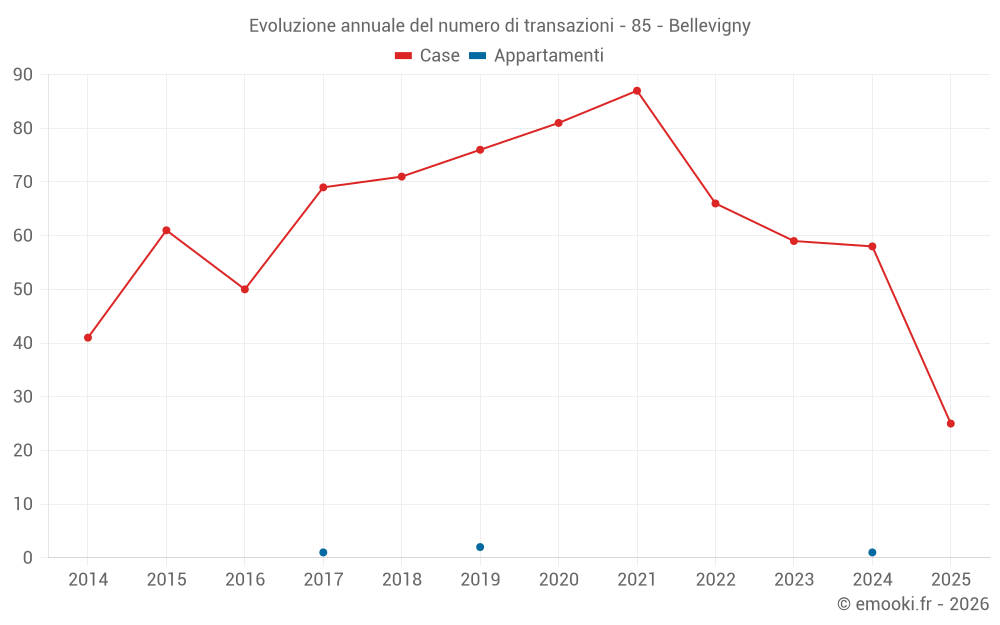 Il prezzo mediano sulle 25 transazioni di case degli ultimi 6 mesi nel comune di Bellevigny era di 2 078 € al metro quadrato per un valore patrimoniale mediano di 206 800 €. In questo periodo il 60% delle transazioni era tra 1 932 e 2 551 € al metro quadrato (dal 2° all'8° decile).