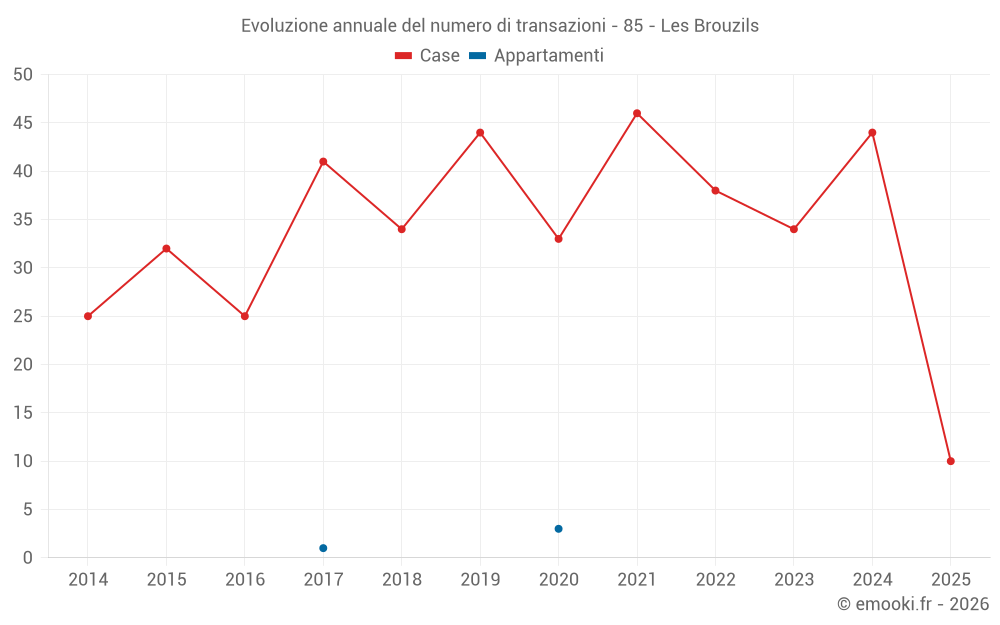 Il prezzo mediano sulle 30 transazioni di case degli ultimi 12 mesi nel comune di Les Brouzils era di 2 131 € al metro quadrato per un valore patrimoniale mediano di 184 500 €. In questo periodo il 60% delle transazioni era tra 1 329 e 2 403 € al metro quadrato (dal 2° all'8° decile).