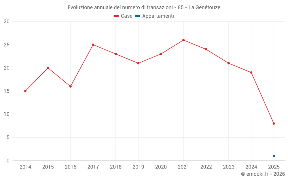 Il prezzo mediano sulle 21 transazioni di case degli ultimi 12 mesi nel comune di La Genétouze era di 2 308 € al metro quadrato per un valore patrimoniale mediano di 230 000 €. In questo periodo il 60% delle transazioni era tra 1 726 e 2 527 € al metro quadrato (dal 2° all'8° decile).