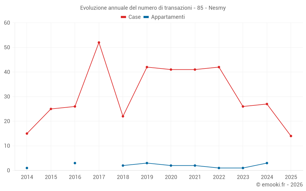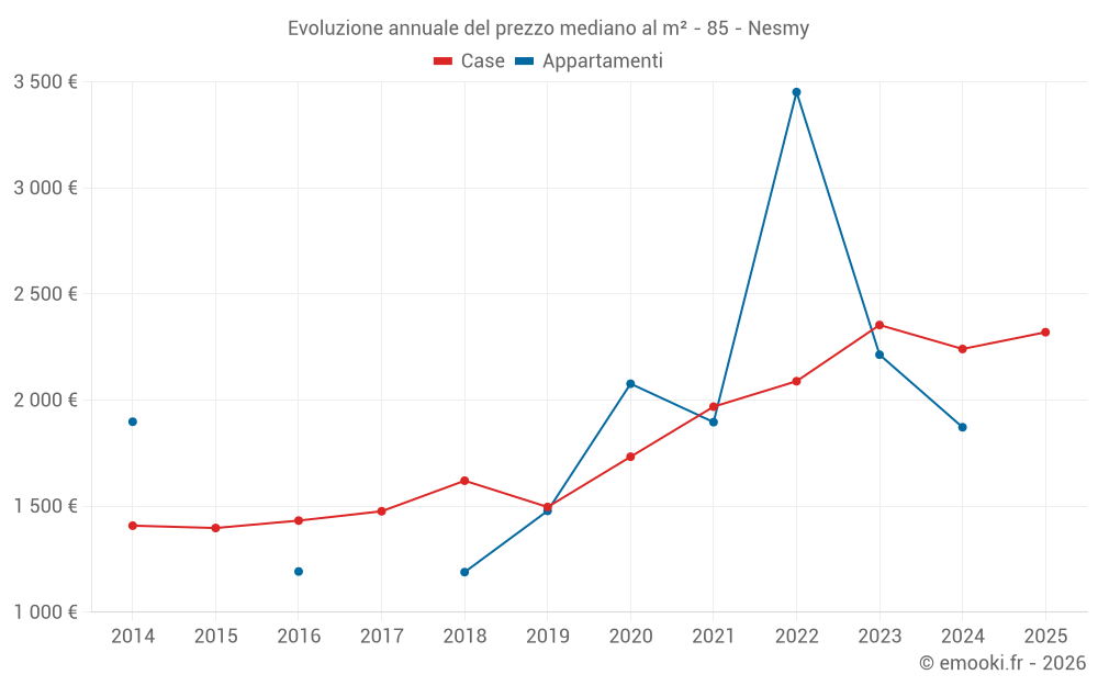 Il prezzo mediano sulle 27 transazioni di case degli ultimi 12 mesi nel comune di Nesmy era di 2 267 € al metro quadrato per un valore patrimoniale mediano di 195 000 €. In questo periodo il 60% delle transazioni era tra 1 545 e 2 573 € al metro quadrato (dal 2° all'8° decile).