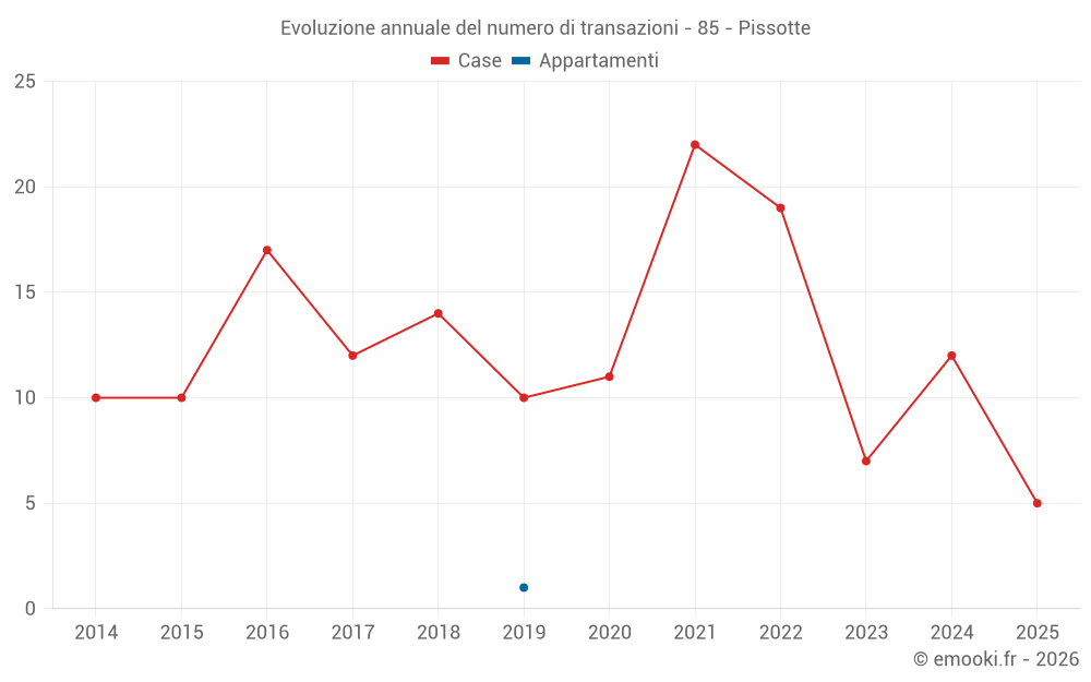 Il prezzo mediano sulle 22 transazioni di case degli ultimi 24 mesi nel comune di Pissotte era di 1 062 € al metro quadrato per un valore patrimoniale mediano di 133 250 €. In questo periodo il 60% delle transazioni era tra 617 e 2 004 € al metro quadrato (dal 2° all'8° decile).