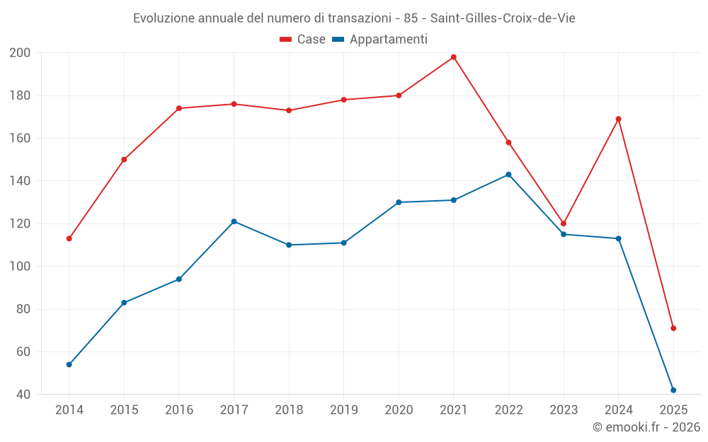 Il prezzo mediano sulle 42 transazioni di appartamenti degli ultimi 6 mesi nel comune di Saint-Gilles-Croix-de-Vie era di 4 662 € al metro quadrato per un valore patrimoniale mediano di 201 432 €. In questo periodo il 60% delle transazioni era tra 3 287 e 5 733 € al metro quadrato (dal 2° all'8° decile).