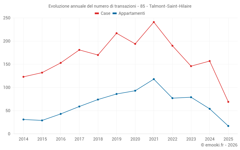 Il prezzo mediano sulle 45 transazioni di appartamenti degli ultimi 12 mesi nel comune di Talmont-Saint-Hilaire era di 3 432 € al metro quadrato per un valore patrimoniale mediano di 109 300 €. In questo periodo il 60% delle transazioni era tra 3 088 e 4 014 € al metro quadrato (dal 2° all'8° decile).