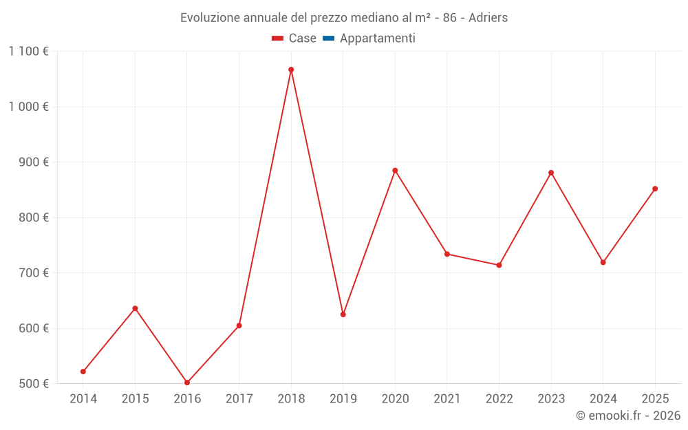 Il prezzo mediano sulle 32 transazioni di case degli ultimi 24 mesi nel comune di Adriers era di 818 € al metro quadrato per un valore patrimoniale mediano di 62 891 €. In questo periodo il 60% delle transazioni era tra 445 e 1 206 € al metro quadrato (dal 2° all'8° decile).