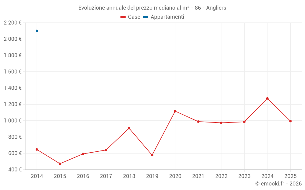 Il prezzo mediano sulle 18 transazioni di case degli ultimi 24 mesi nel comune di Angliers era di 1 162 € al metro quadrato per un valore patrimoniale mediano di 118 500 €. In questo periodo il 60% delle transazioni era tra 830 e 1 409 € al metro quadrato (dal 2° all'8° decile).