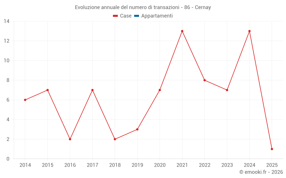 Il prezzo mediano sulle 16 transazioni di case degli ultimi 24 mesi nel comune di Cernay era di 1 471 € al metro quadrato per un valore patrimoniale mediano di 131 900 €. In questo periodo il 60% delle transazioni era tra 619 e 1 870 € al metro quadrato (dal 2° all'8° decile).