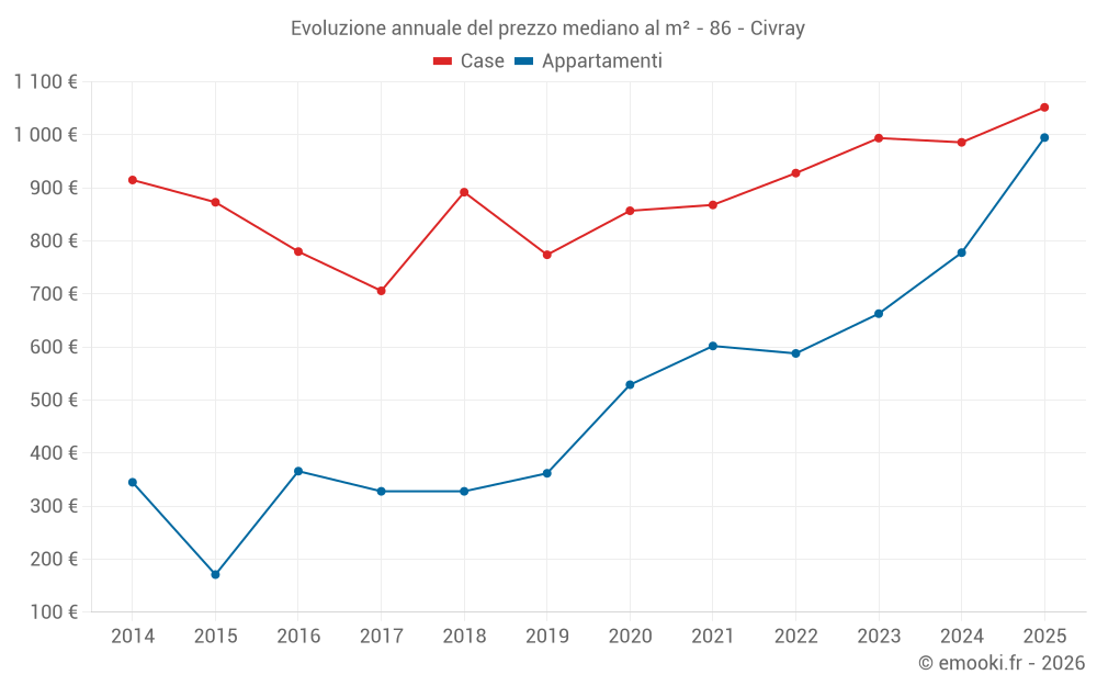 Il prezzo mediano sulle 22 transazioni di case degli ultimi 6 mesi nel comune di Civray era di 1 052 € al metro quadrato per un valore patrimoniale mediano di 109 000 €. In questo periodo il 60% delle transazioni era tra 521 e 1 659 € al metro quadrato (dal 2° all'8° decile).
