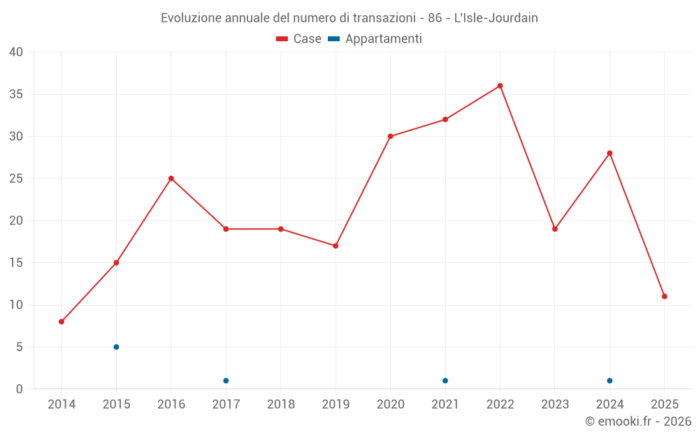 Il prezzo mediano sulle 29 transazioni di case degli ultimi 12 mesi nel comune di L'Isle-Jourdain era di 957 € al metro quadrato per un valore patrimoniale mediano di 87 000 €. In questo periodo il 60% delle transazioni era tra 574 e 1 436 € al metro quadrato (dal 2° all'8° decile).