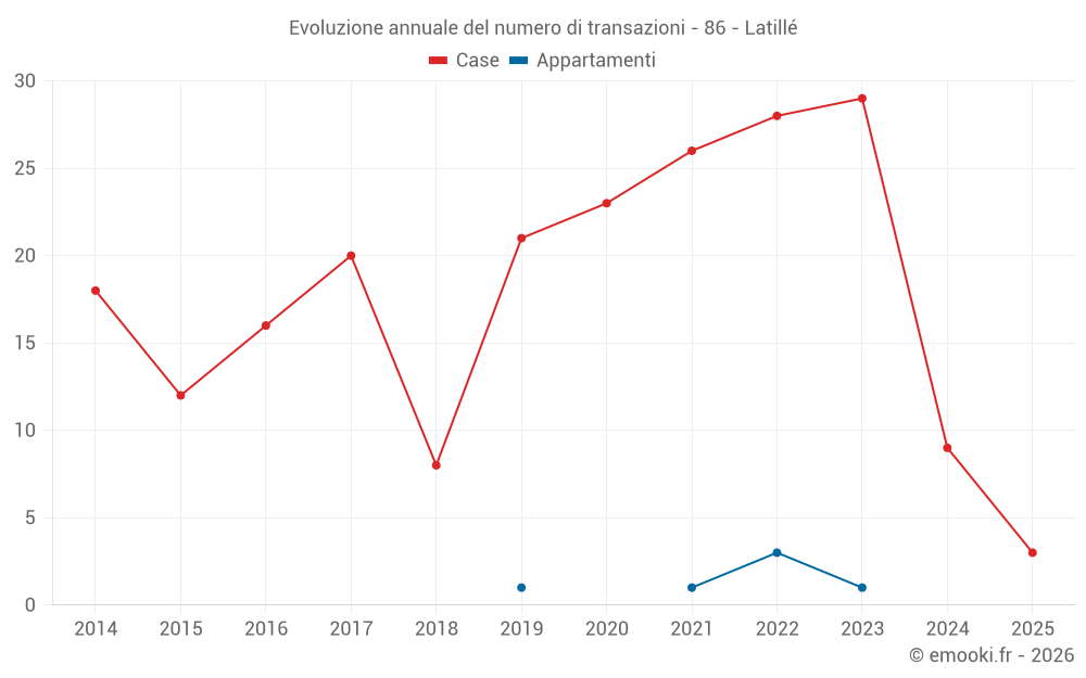 Il prezzo mediano sulle 28 transazioni di case degli ultimi 24 mesi nel comune di Latillé era di 1 465 € al metro quadrato per un valore patrimoniale mediano di 152 000 €. In questo periodo il 60% delle transazioni era tra 1 095 e 1 718 € al metro quadrato (dal 2° all'8° decile).
