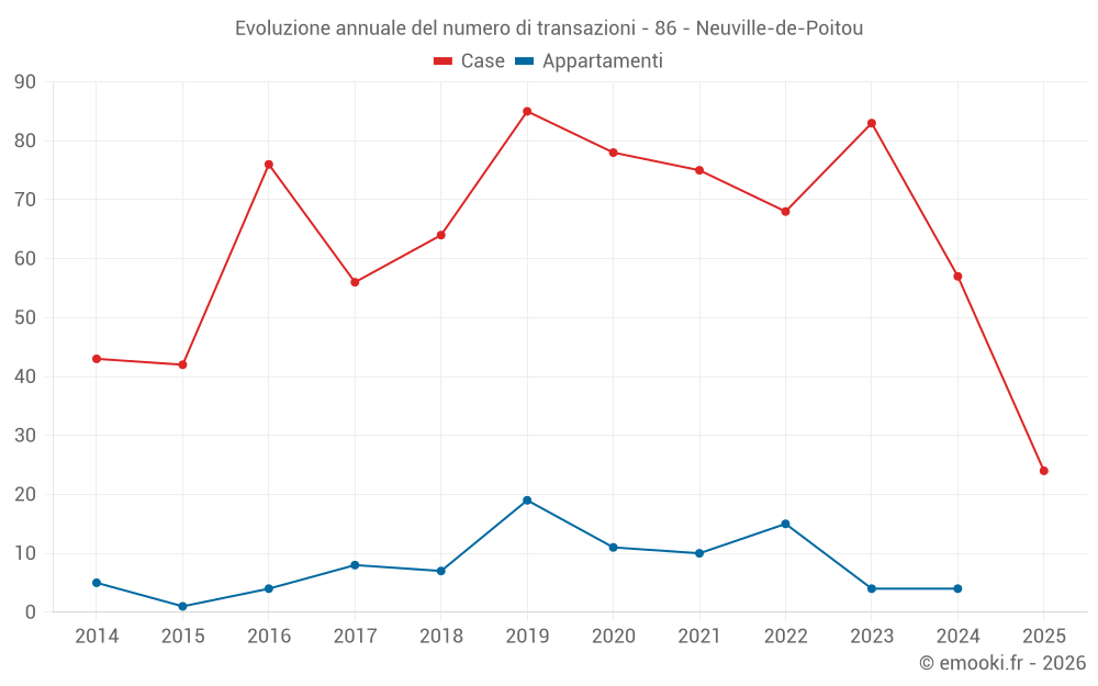 Il prezzo mediano sulle 24 transazioni di case degli ultimi 6 mesi nel comune di Neuville-de-Poitou era di 1 794 € al metro quadrato per un valore patrimoniale mediano di 192 142 €. In questo periodo il 60% delle transazioni era tra 1 313 e 2 221 € al metro quadrato (dal 2° all'8° decile).