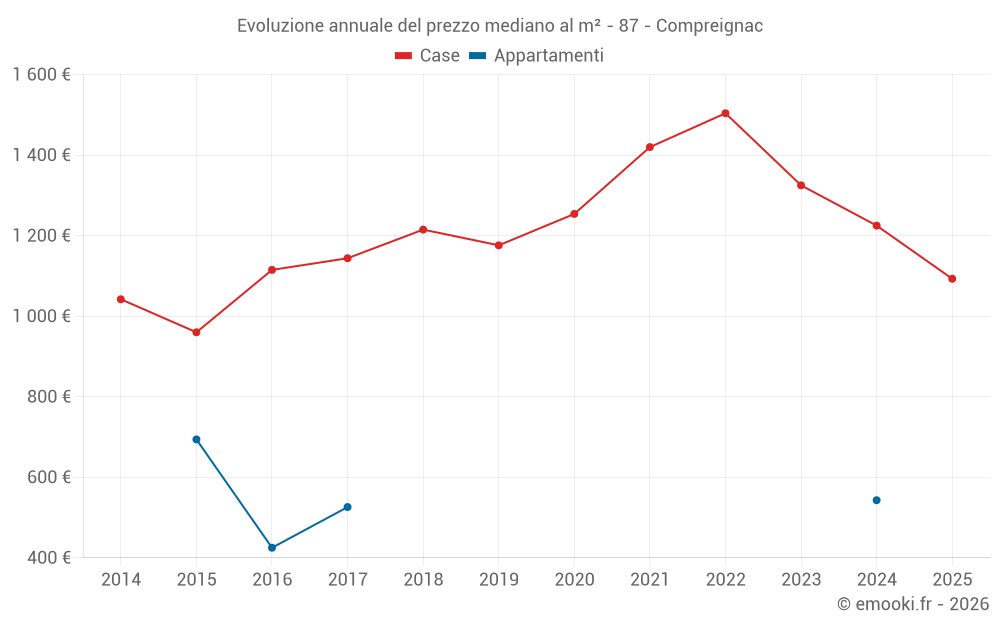 Il prezzo mediano sulle 25 transazioni di case degli ultimi 12 mesi nel comune di Compreignac era di 1 170 € al metro quadrato per un valore patrimoniale mediano di 95 000 €. In questo periodo il 60% delle transazioni era tra 691 e 1 555 € al metro quadrato (dal 2° all'8° decile).