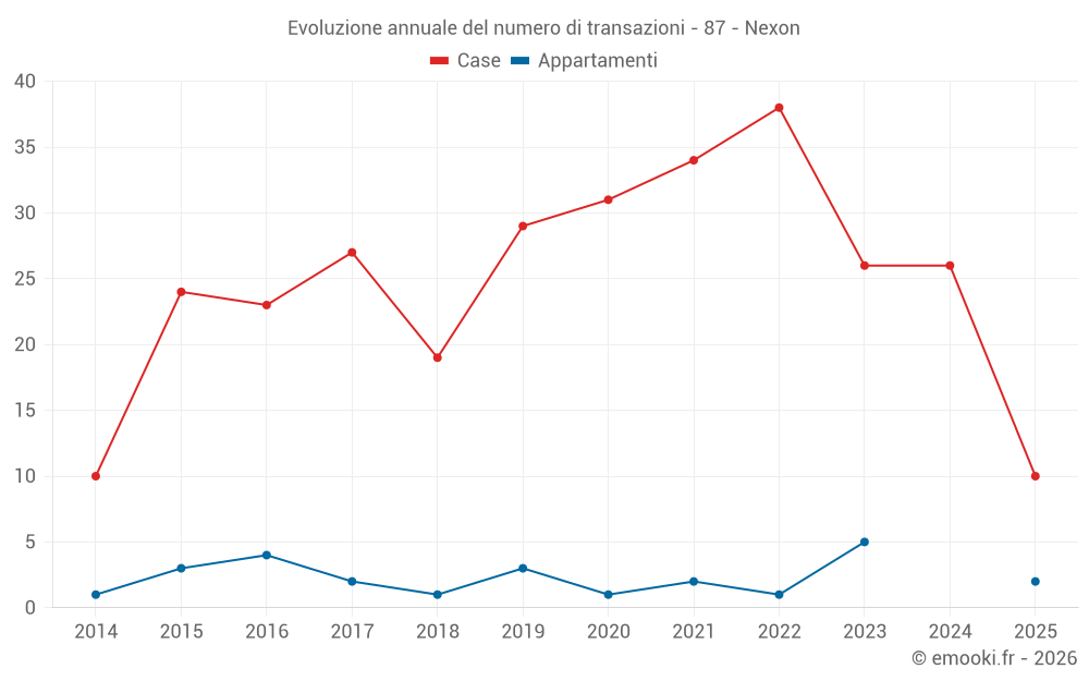 Il prezzo mediano sulle 25 transazioni di case degli ultimi 12 mesi nel comune di Nexon era di 1 350 € al metro quadrato per un valore patrimoniale mediano di 115 000 €. In questo periodo il 60% delle transazioni era tra 979 e 1 700 € al metro quadrato (dal 2° all'8° decile).