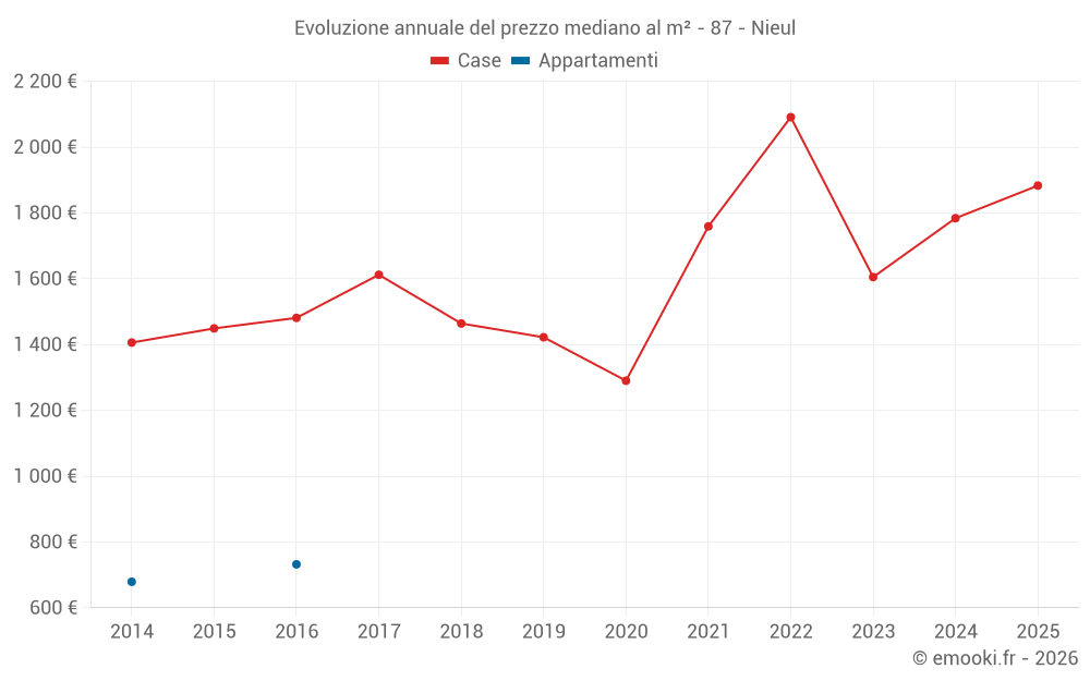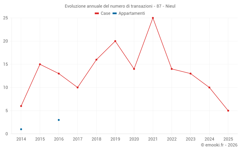 Il prezzo mediano sulle 24 transazioni di case degli ultimi 24 mesi nel comune di Nieul era di 1 784 € al metro quadrato per un valore patrimoniale mediano di 166 300 €. In questo periodo il 60% delle transazioni era tra 1 109 e 1 965 € al metro quadrato (dal 2° all'8° decile).