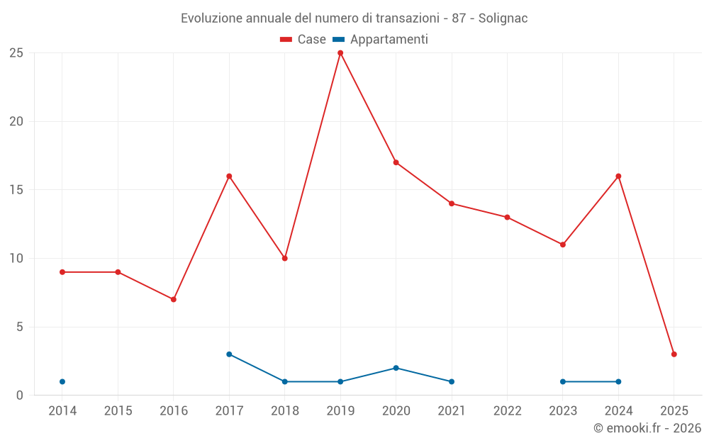 Il prezzo mediano sulle 24 transazioni di case degli ultimi 24 mesi nel comune di Solignac era di 1 646 € al metro quadrato per un valore patrimoniale mediano di 169 750 €. In questo periodo il 60% delle transazioni era tra 1 185 e 1 941 € al metro quadrato (dal 2° all'8° decile).