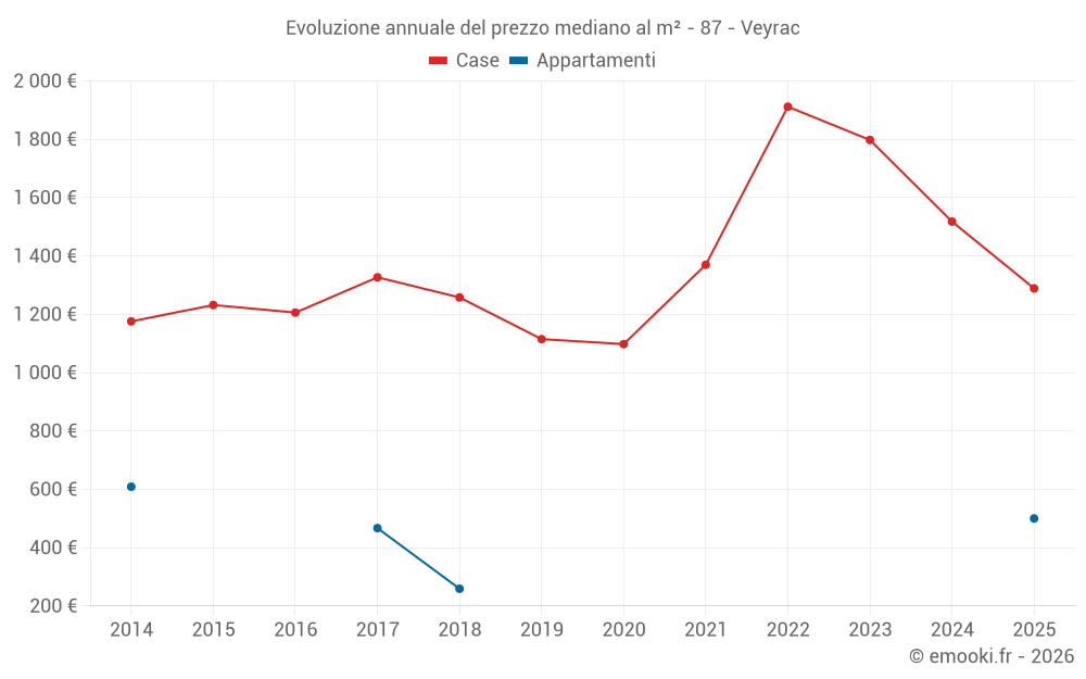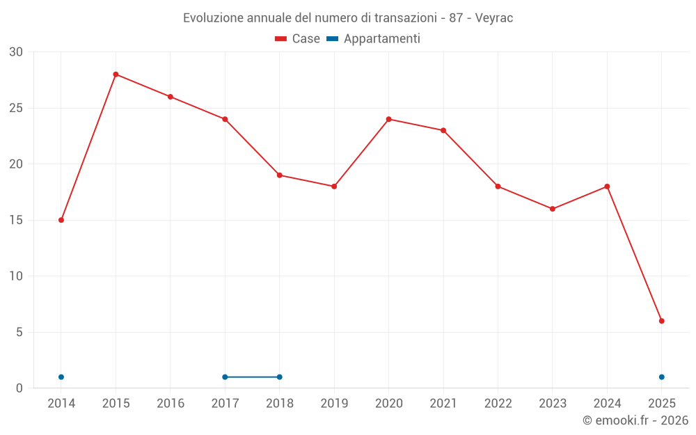 Il prezzo mediano sulle 32 transazioni di case degli ultimi 24 mesi nel comune di Veyrac era di 1 398 € al metro quadrato per un valore patrimoniale mediano di 143 775 €. In questo periodo il 60% delle transazioni era tra 962 e 1 922 € al metro quadrato (dal 2° all'8° decile).