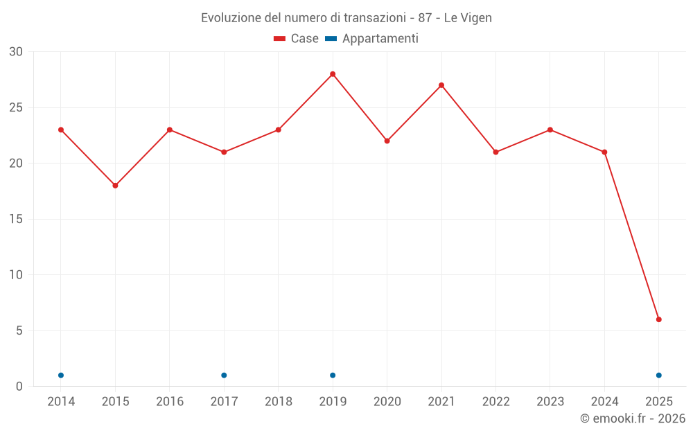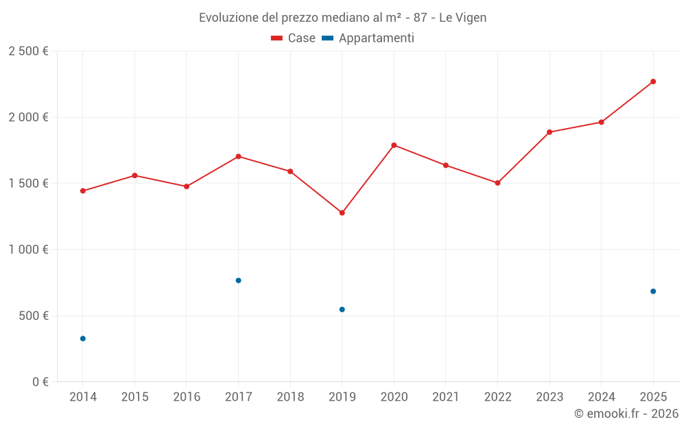 Il prezzo mediano sulle 21 transazioni di case degli ultimi 12 mesi nel comune di Le Vigen era di 2 005 € al metro quadrato per un valore patrimoniale mediano di 228 000 €. In questo periodo il 60% delle transazioni era tra 1 250 e 2 333 € al metro quadrato (dal 2° all'8° decile).