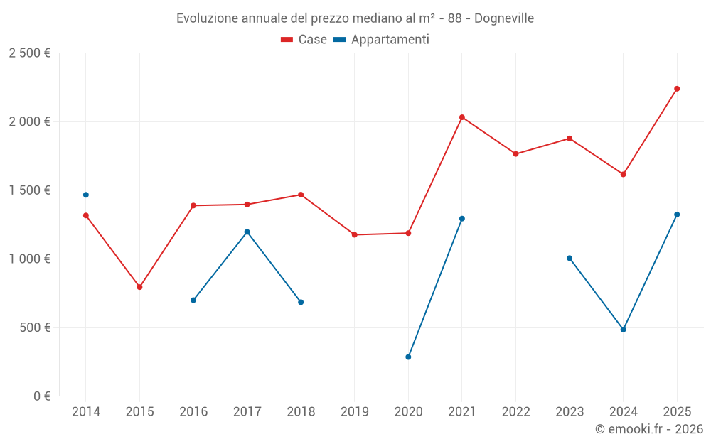 Il prezzo mediano sulle 21 transazioni di case degli ultimi 24 mesi nel comune di Dogneville era di 1 950 € al metro quadrato per un valore patrimoniale mediano di 195 000 €. In questo periodo il 60% delle transazioni era tra 1 175 e 2 386 € al metro quadrato (dal 2° all'8° decile).