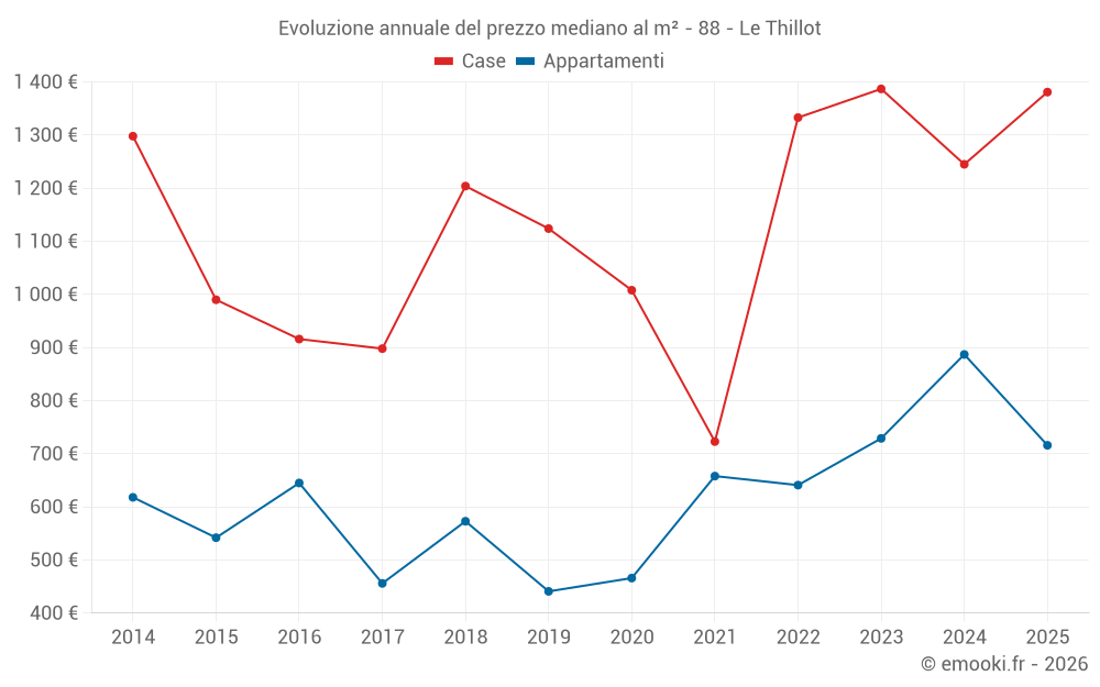 Il prezzo mediano sulle 21 transazioni di case degli ultimi 12 mesi nel comune di Le Thillot era di 1 381 € al metro quadrato per un valore patrimoniale mediano di 157 700 €. In questo periodo il 60% delle transazioni era tra 1 014 e 2 169 € al metro quadrato (dal 2° all'8° decile).