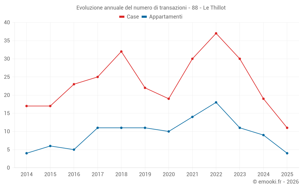 Il prezzo mediano sulle 19 transazioni di appartamenti degli ultimi 24 mesi nel comune di Le Thillot era di 844 € al metro quadrato per un valore patrimoniale mediano di 89 685 €. In questo periodo il 60% delle transazioni era tra 576 e 1 298 € al metro quadrato (dal 2° all'8° decile).
