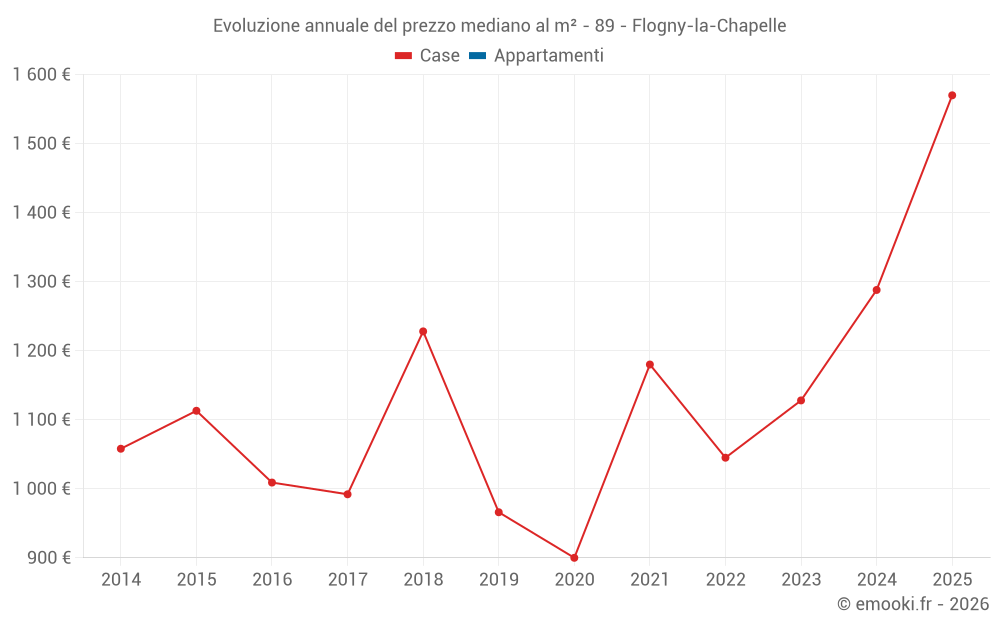Il prezzo mediano sulle 24 transazioni di case degli ultimi 24 mesi nel comune di Flogny-la-Chapelle era di 1 241 € al metro quadrato per un valore patrimoniale mediano di 129 250 €. In questo periodo il 60% delle transazioni era tra 855 e 1 608 € al metro quadrato (dal 2° all'8° decile).