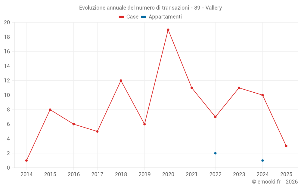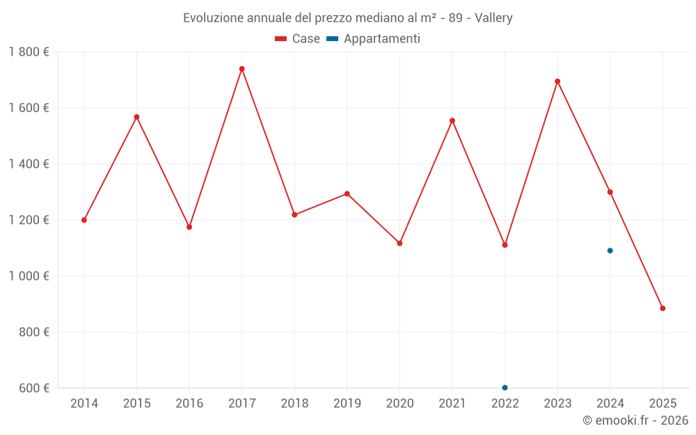 Il prezzo mediano sulle 19 transazioni di case degli ultimi 24 mesi nel comune di Vallery era di 1 385 € al metro quadrato per un valore patrimoniale mediano di 118 000 €. In questo periodo il 60% delle transazioni era tra 862 e 1 902 € al metro quadrato (dal 2° all'8° decile).