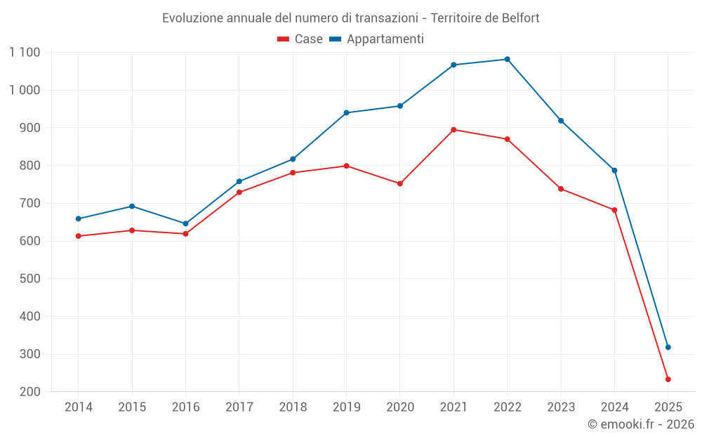 Il prezzo mediano sulle 111 transazioni di appartamenti degli ultimi 3 mesi nel dipartimento di Territoire de Belfort era di 1 118 € al metro quadrato per un valore patrimoniale mediano di 79 000 €. In questo periodo il 60% delle transazioni era tra 851 e 1 538 € al metro quadrato (dal 2° all'8° decile).