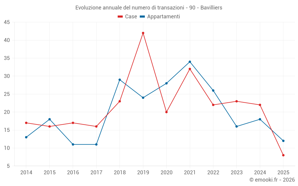 Il prezzo mediano sulle 19 transazioni di case degli ultimi 12 mesi nel comune di Bavilliers era di 1 647 € al metro quadrato per un valore patrimoniale mediano di 160 000 €. In questo periodo il 60% delle transazioni era tra 1 255 e 2 052 € al metro quadrato (dal 2° all'8° decile).