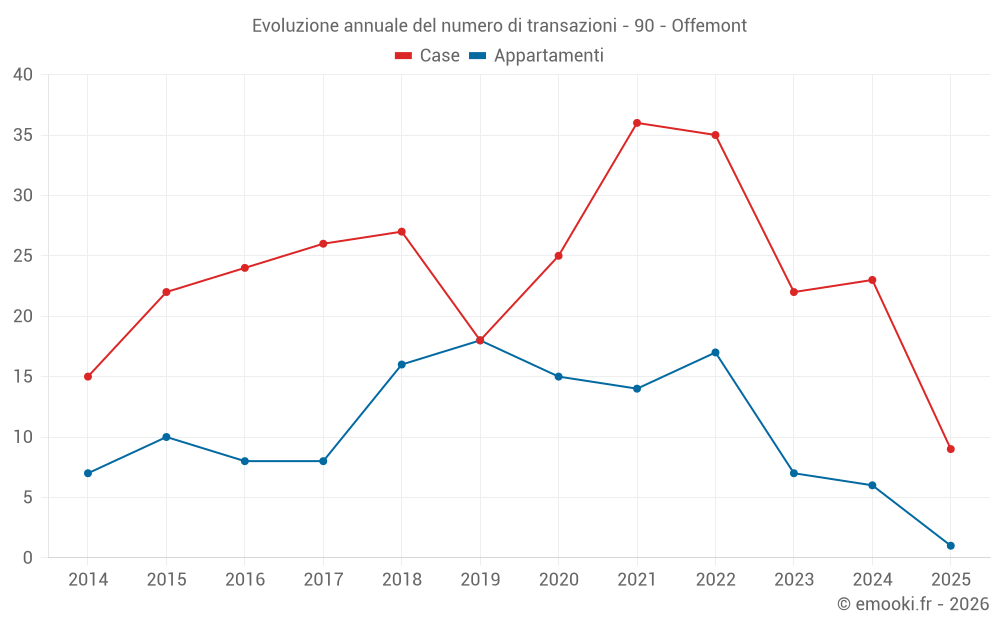 Il prezzo mediano sulle 14 transazioni di appartamenti degli ultimi 24 mesi nel comune di Offemont era di 1 602 € al metro quadrato per un valore patrimoniale mediano di 88 500 €. In questo periodo il 60% delle transazioni era tra 978 e 2 114 € al metro quadrato (dal 2° all'8° decile).