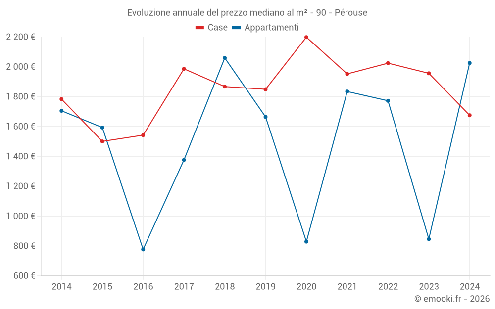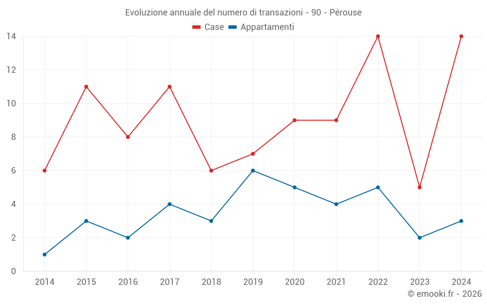 Il prezzo mediano sulle 17 transazioni di case degli ultimi 24 mesi nel comune di Pérouse era di 1 751 € al metro quadrato per un valore patrimoniale mediano di 205 400 €. In questo periodo il 60% delle transazioni era tra 1 053 e 2 120 € al metro quadrato (dal 2° all'8° decile).